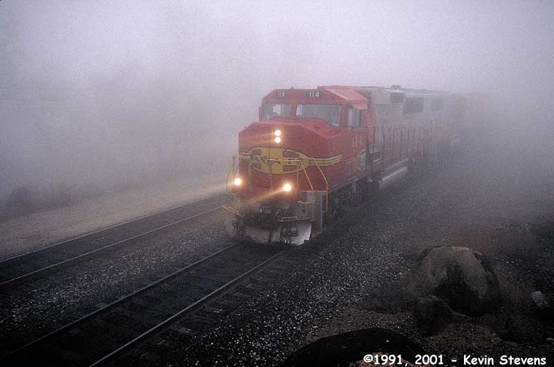 Sometimes, Tehachapi weather can change before your eyes. Minutes before, the visibility was fairly good with the clouds hovering above. Very quickly, the clouds decided to drop, leaving the visibility at roughly the length of two GP60M's.