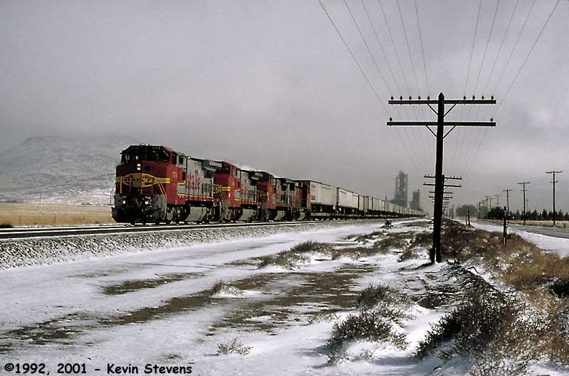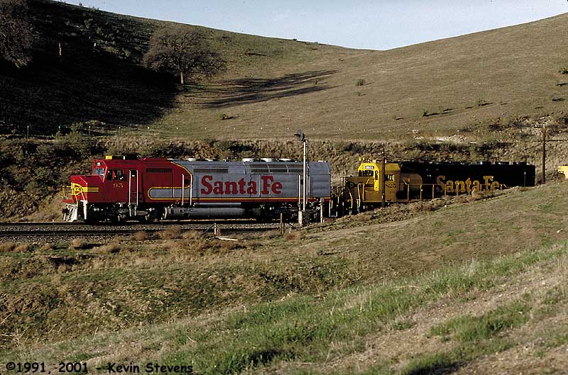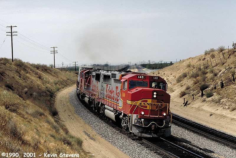 In 1989, Santa Fe's public relations department decided to revive the popular colors for use on new wide-cab power scheduled for delivery in 1990. The new power was given the title "Super Fleet". All Santa Fe power delivered between 1990 and the BNSF merger would be delivered in the red and silver Warbonnet paint. As a prelude to the arrival of new Super Fleet power, Santa Fe returned their remaining SDFP45's to a modified version of their original colors. The photos below are a snapshot of some of these final years of the Atchison, Topeka and Santa Fe Railway.