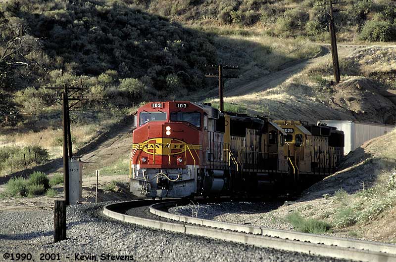 When first delivered, many 100 class GP60M's ran in sets of 3 or 4 on Santa Fe's hottest intermodal trains. One such train approaches Tunnel #9 at Walong and will soon cross over itself on the famous loop.