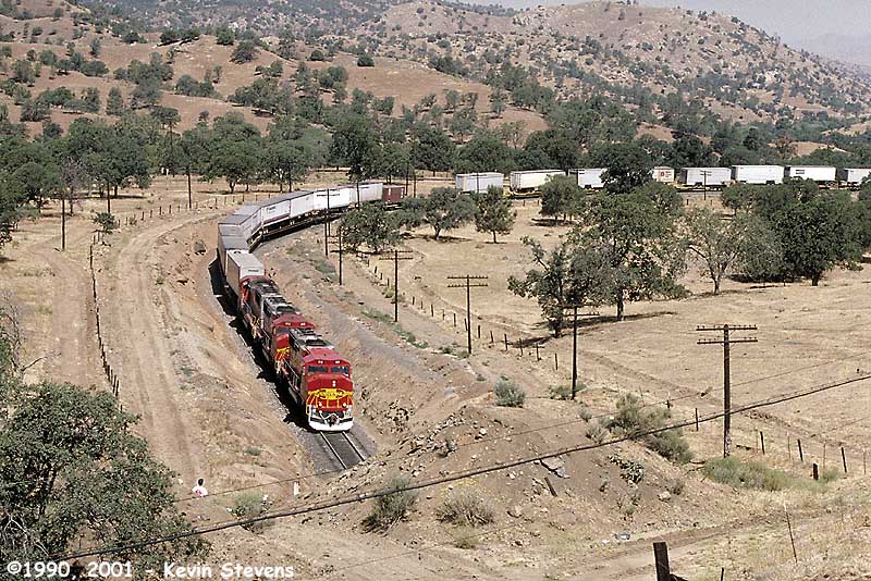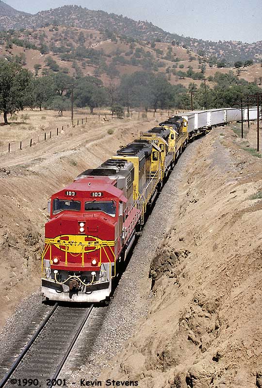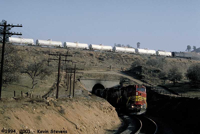 While Southern Pacific trains were mainly lumber drags and general merchandise, Santa Fe was mainly intermodal. A Westbound glides out of Tunnel #3 approaching Bealville leading a string of trailers toward the port of Richmond, CA.