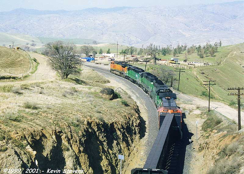 Coming out of an area known as the Caliente Creek Narrows, an Eastbound BNSF train skirts the creek on a sweeping S curve. This area was recently (1983) double tracked by connecting the sidings of Ilmon to the west, and Caliente to the east.