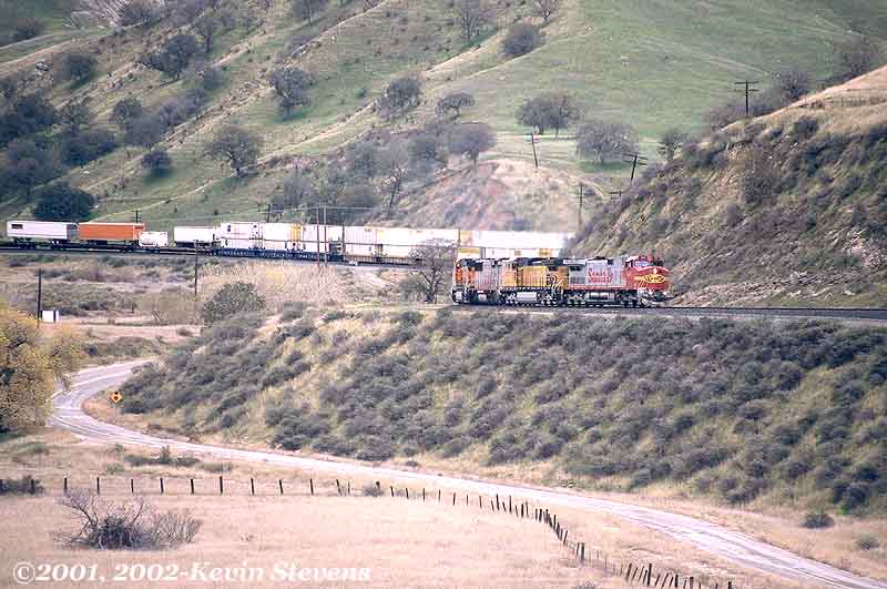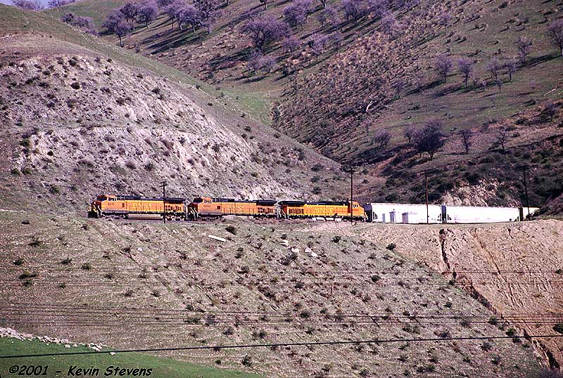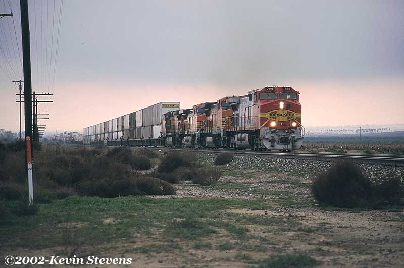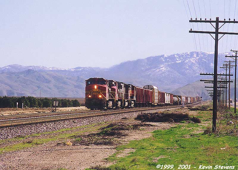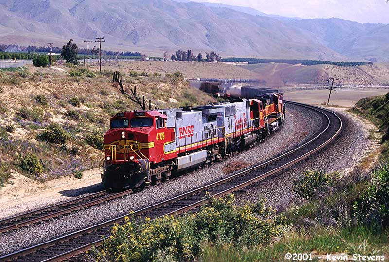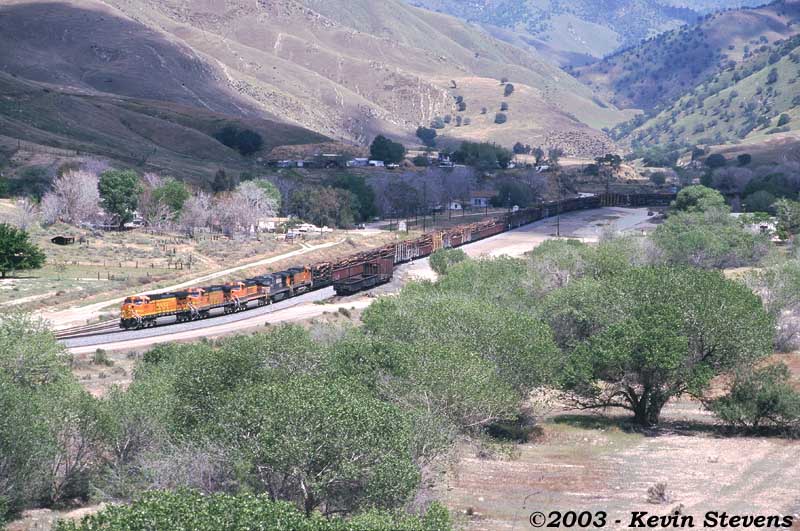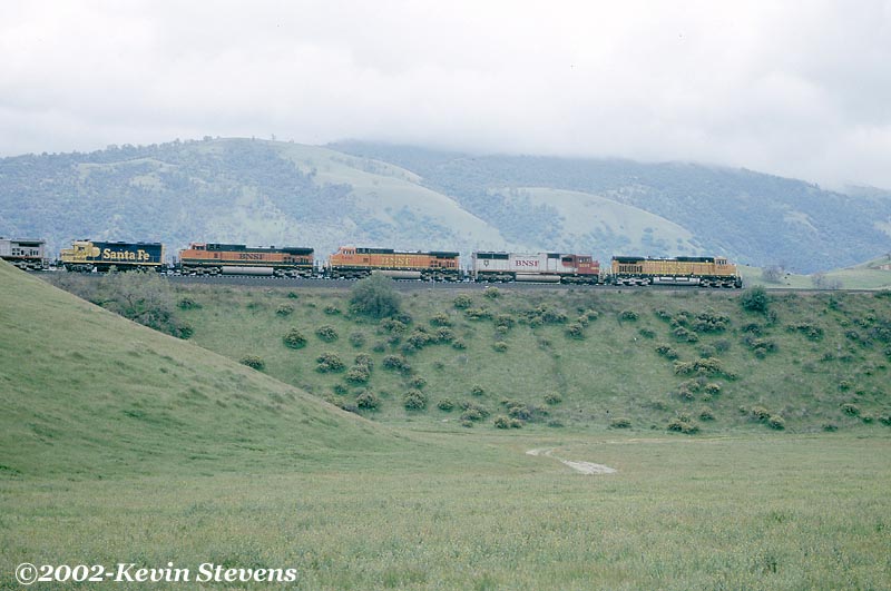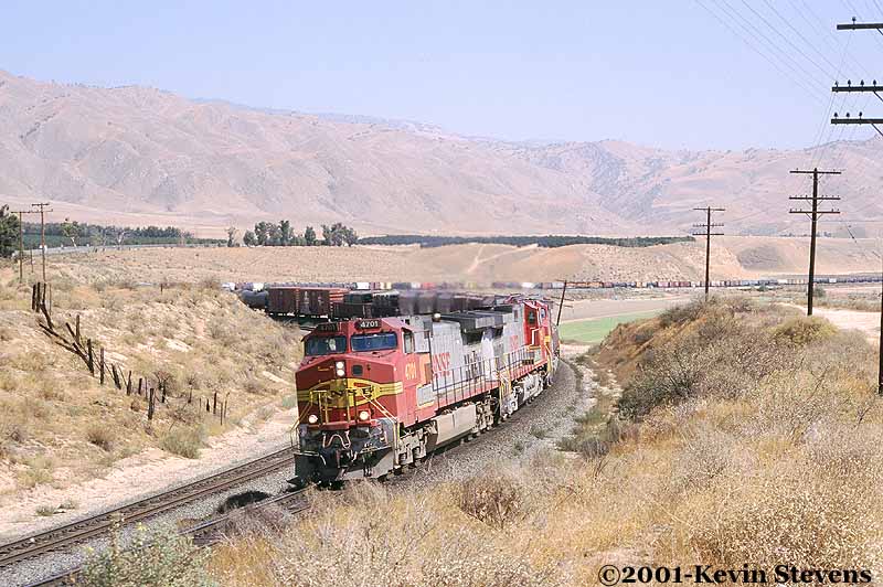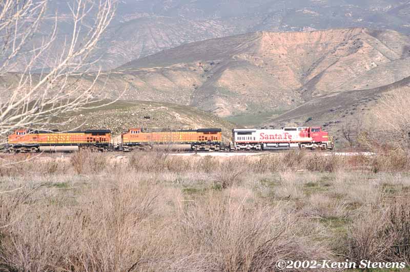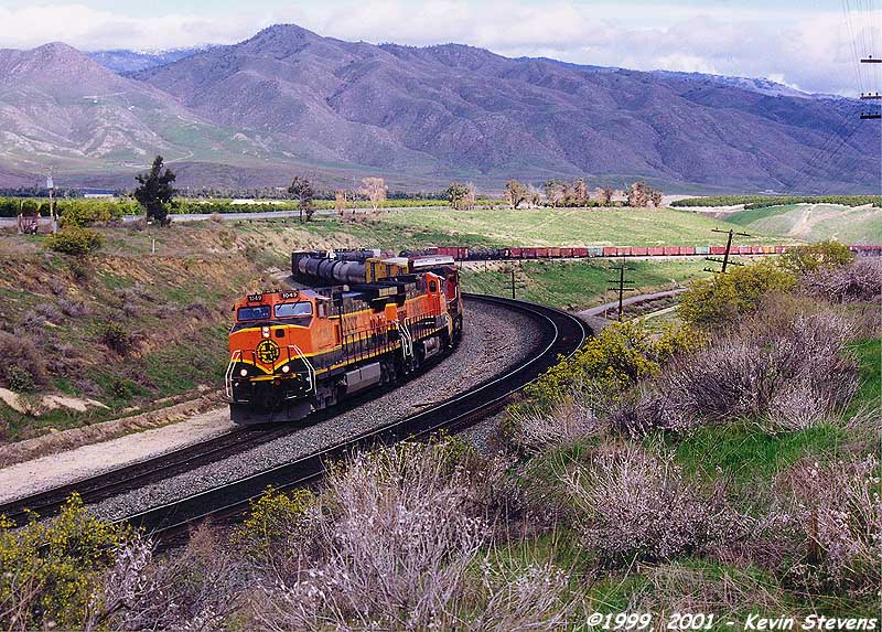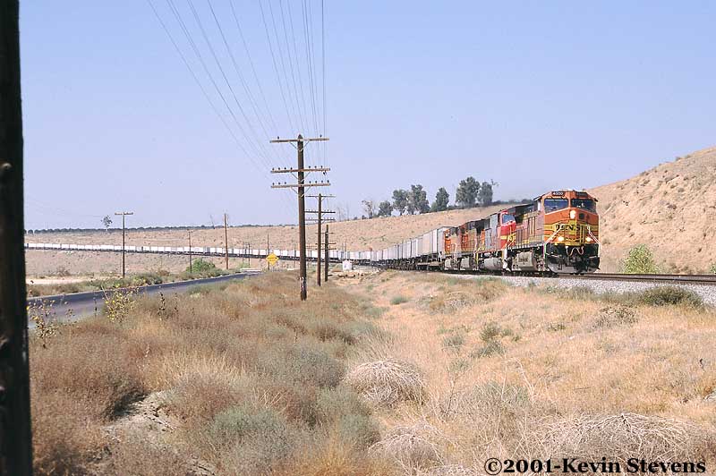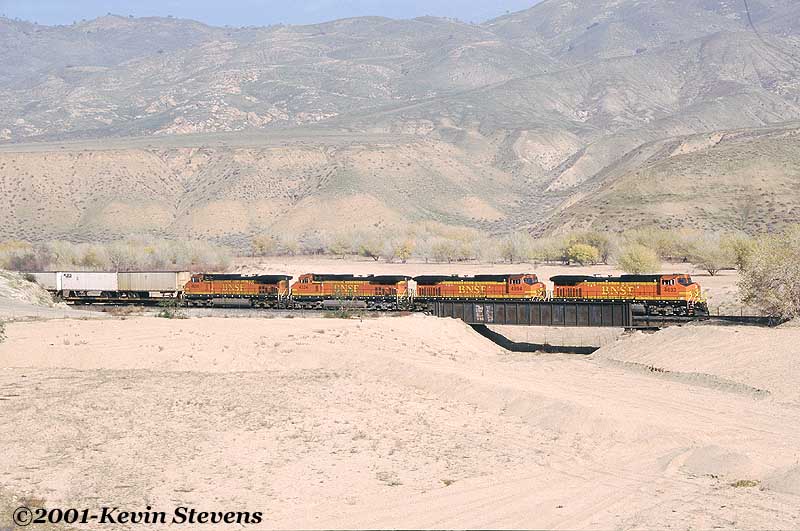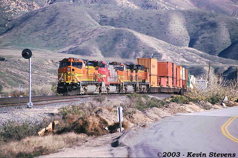 Having made the descent from Tehachapi Summit, the crew of this Westbound BNSF train is only a few miles away from the end of their run. The train will get a new crew at Bakersfield that will take it up the valley north through Fresno and Stockton.