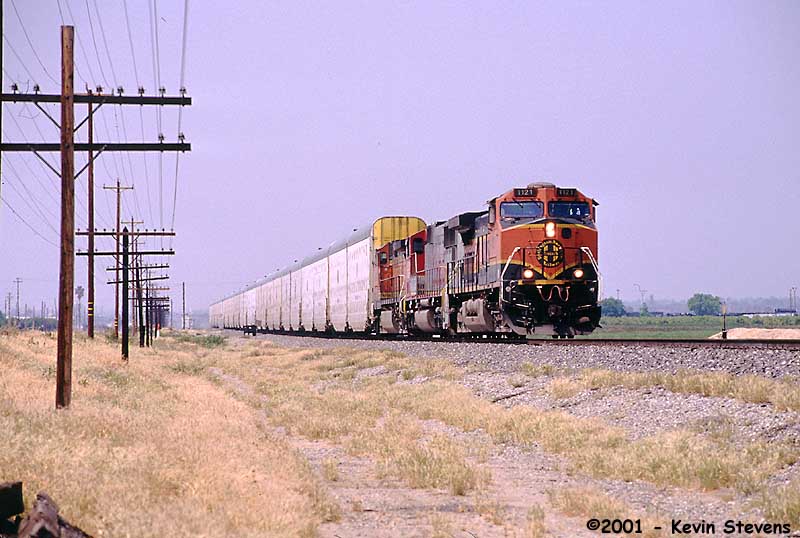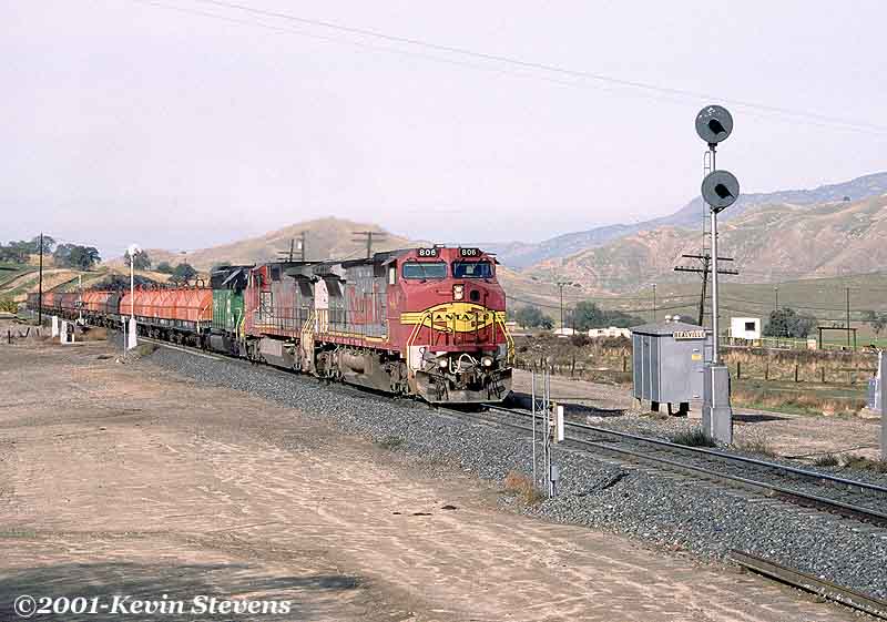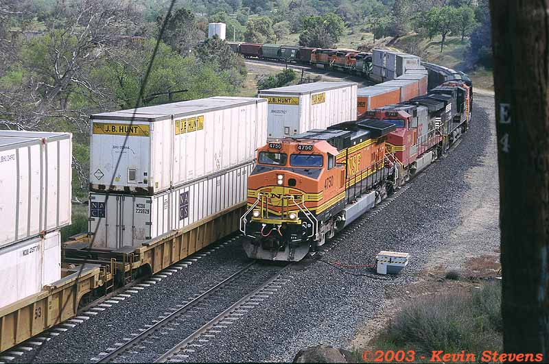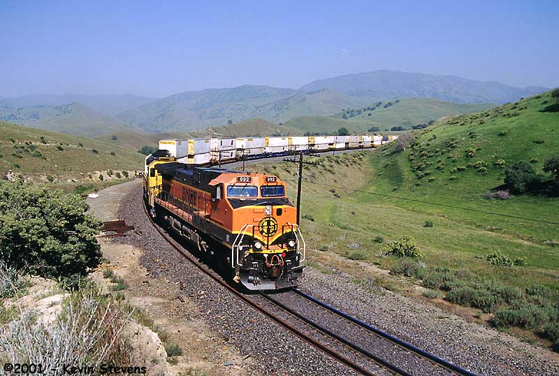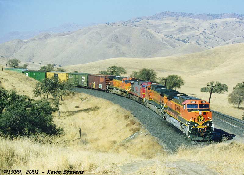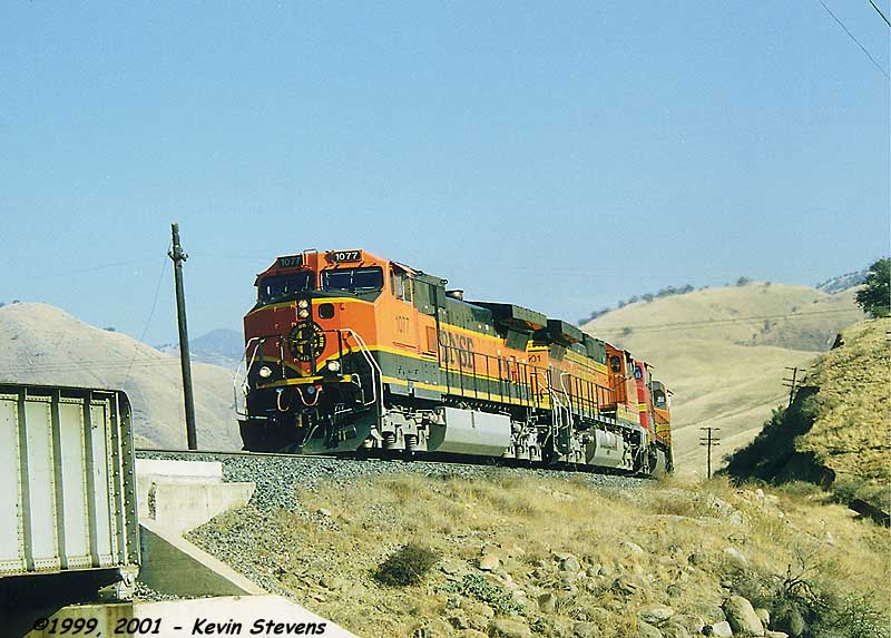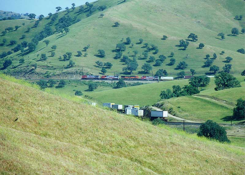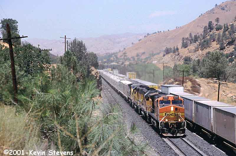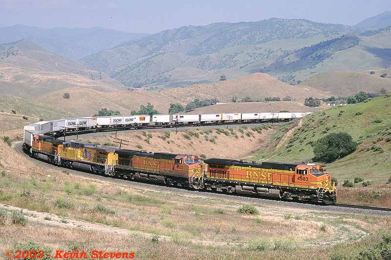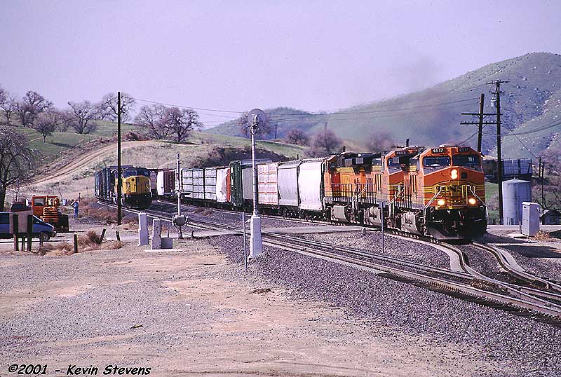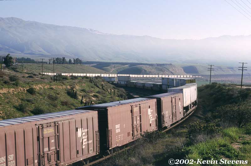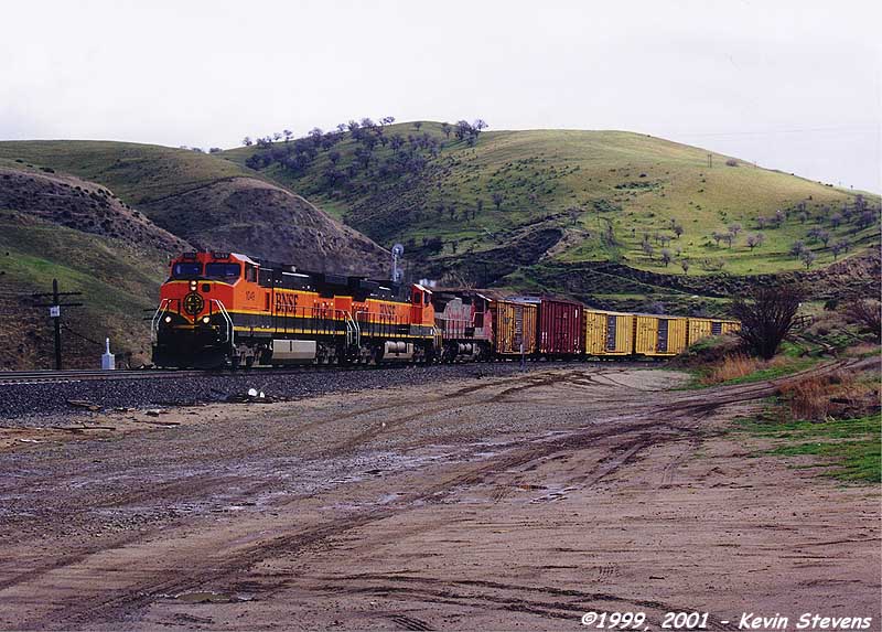 Having made the descent from Tehachapi Summit, the crew of this Westbound BNSF train is only a few miles away from the end of their run. The train will get a new crew at Bakersfield that will take it up the valley north through Fresno and Stockton.