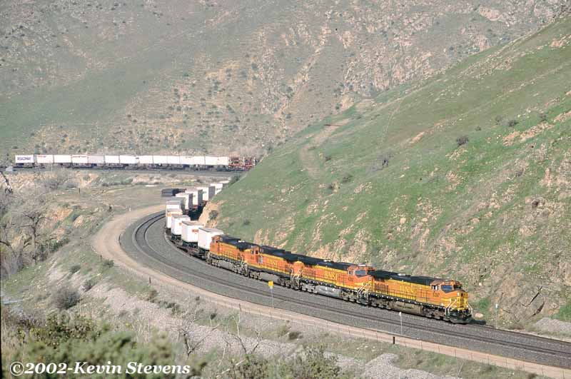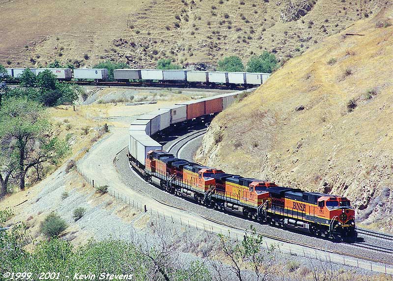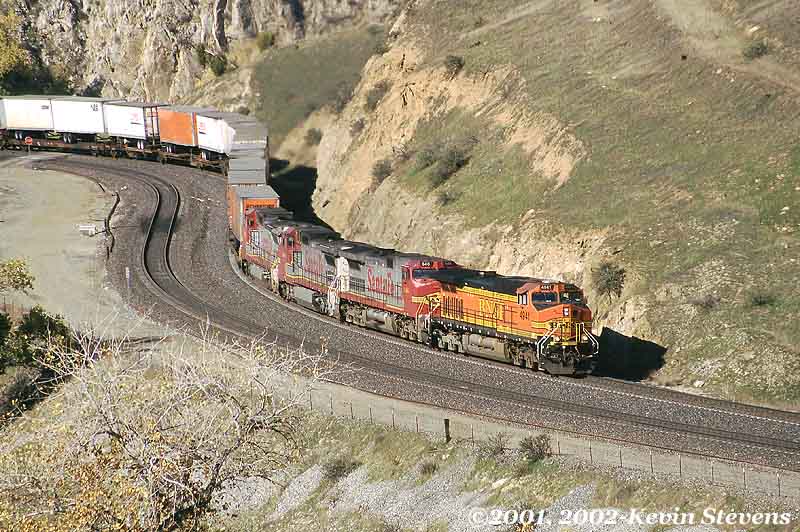 An Eastbound BNSF intermodal train begins the climb up the hill at Caliente with its train still wrapped around the horseshoe curve just out of the frame of the photo to the left.
