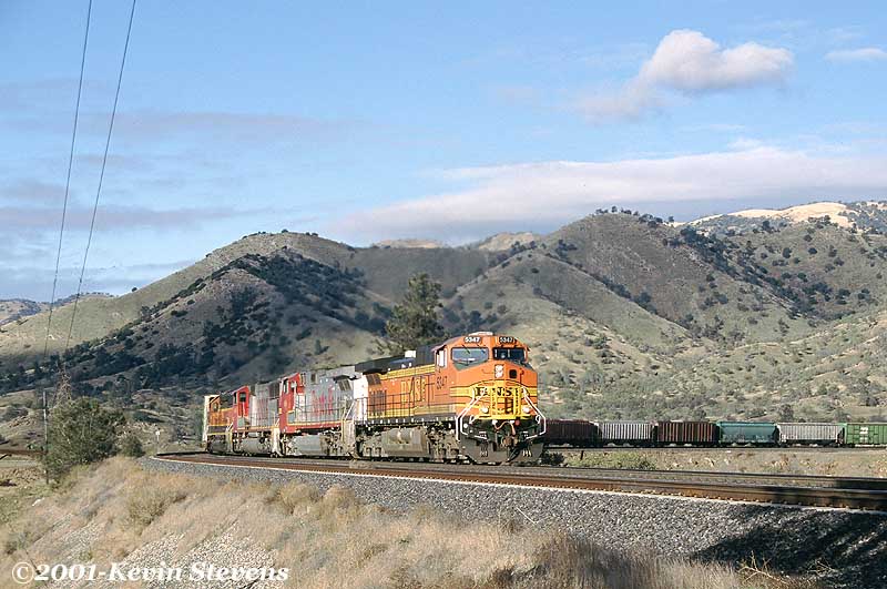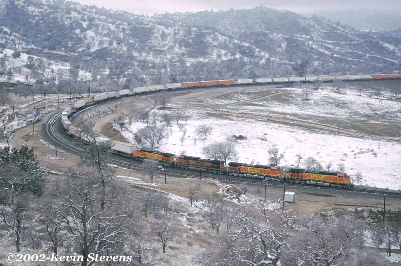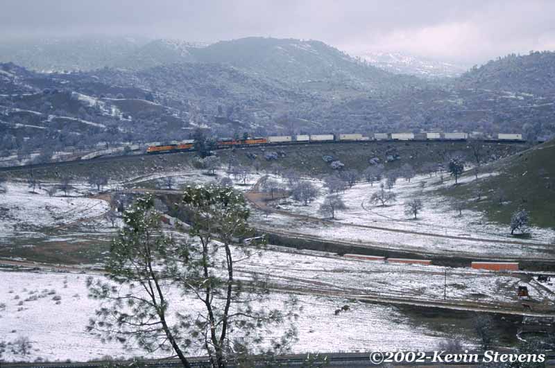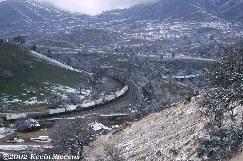 The best time to take photographs in the Tehachapi Mountains is on a relatively clear day after a recent storm. Such is the case on this day, with good sunlight and clear air allowing for amazingly clear and deep photos highlighting the bright colors of the BNSF power with the visible details of the mountains in the background which are usually obscured by the persistant haze.
