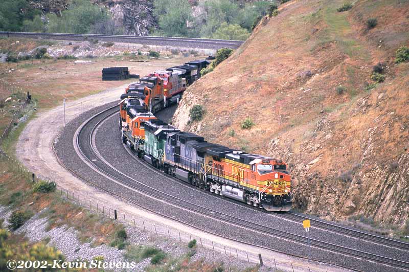 A colorful 10 unit BNSF power move rolls East toward Caliente. The units in this power move included 5 different BNSF paint schemes (BNSF H I, H II, Red/Silver, BN Green, ATSF Yellow) as well as two foreign units (CSX and NS).