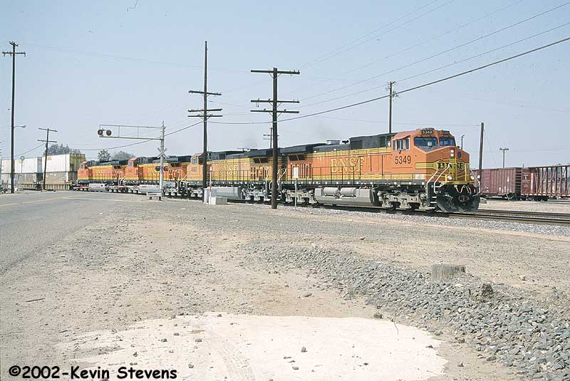 An Eastbound BNSF train is about to enter UP trackage at Kern Junction. The road crossing in view is Sumner Ave.