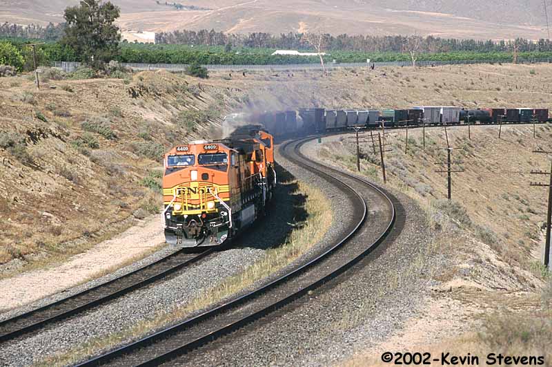 A Westbound BNSF train led by two shiny Red and Silver "Warbonnets" climbs the hill at Sandcut, before reaching the straight downgrade line into Bakersfield.