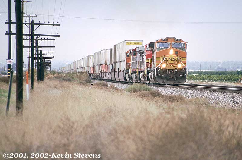 An Eastbound stack train splits the vineyards and orchards that line the tracks East of Edison.