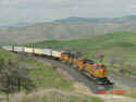 A Northbound BNSF intermodal is shown approaching the Tehachapi Blvd crossing just East of the cement plant.