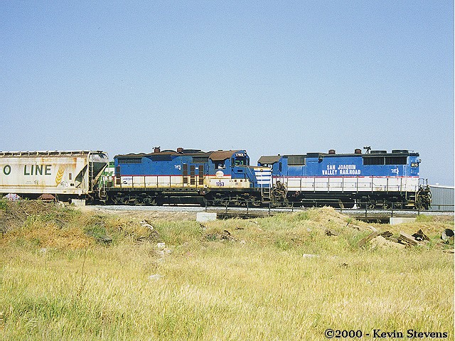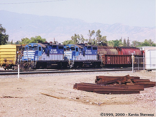 A pair of SJVR GP20's are shown switching cars from a transfer run. SJVR crews routinely do switching work in both UP and BNSF's Bakersfield Yards, with their terminal located at the west end of BNSF's yard.