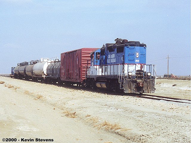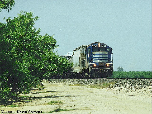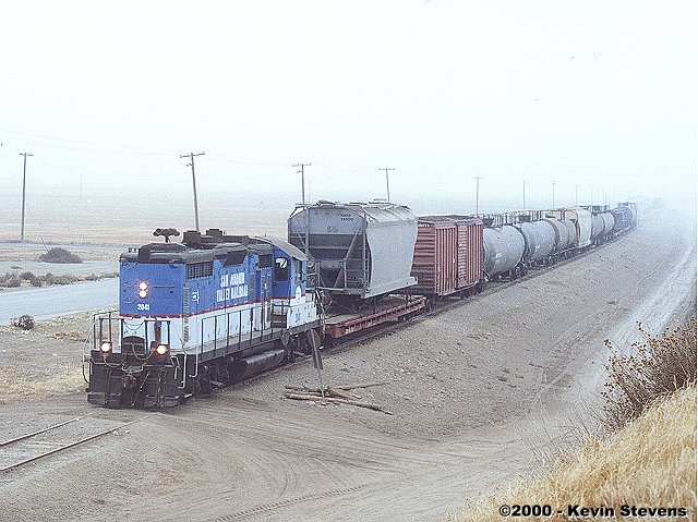 SJVR's Oil City Branch job is shown waiting to enter UP's Valley line on the south leg of the wye at Oil Junction. The tail track of the wye is actually the Oil City Branch which extends about four miles east through the town of Oildale.