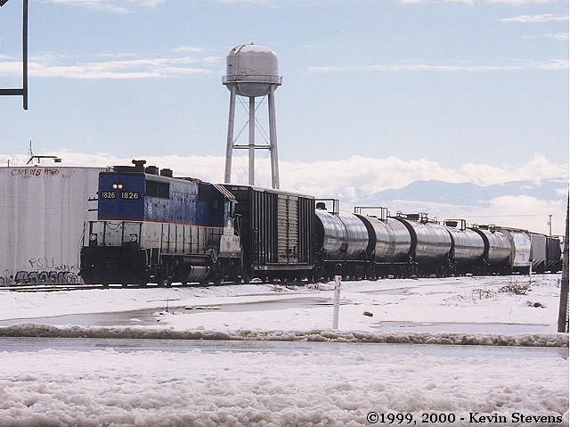 The rare event of snow in Bakersfield finds a SJVR GP9 parked on a siding on the Landco Branch at Oil Junction. The track crossing the lower part of the picture is the UP Bakersfield-Fresno Main Line.