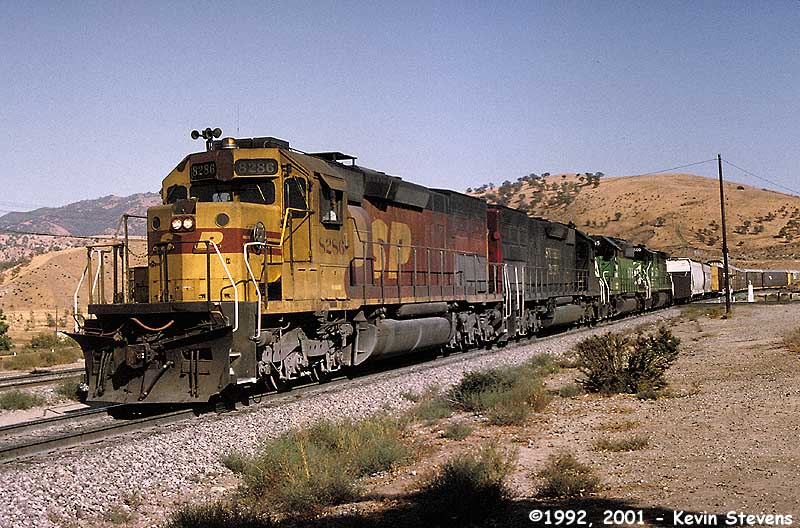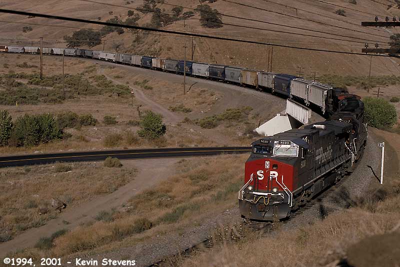 Finally, some new power for SP. In 1994, SP finally received a boost in the form of 101 new GE C44-9W's and 25 EMD SD70M's. One of the GE's lead a collection of older power uphill out of Caliente.