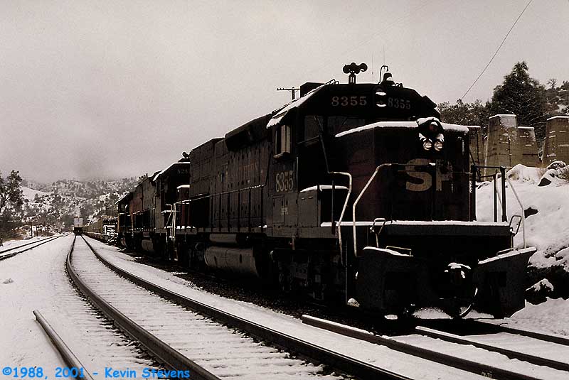 Although Tehachapi isn't known for snow, it does get some from time to time. This view is of a Westbound SP train that has just passed around the loop at Walong.