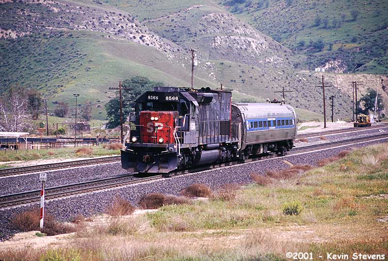 A short train consisting of veteran SP SD40T-2 #8566 and FRA track test car #T-16 rolls downhill through Bealville.