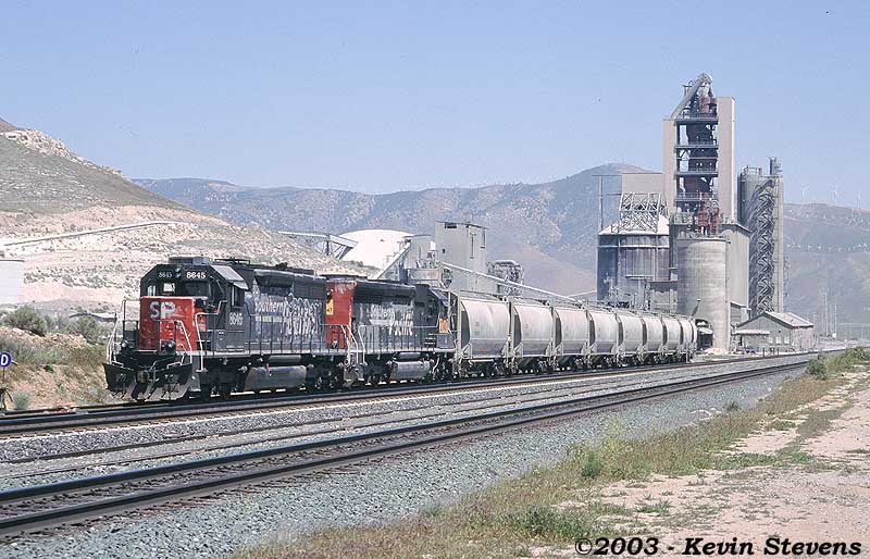 All SP power drags loaded coal hoppers and empty cement hoppers up the hill to the California Portland Cement Company at Creal.