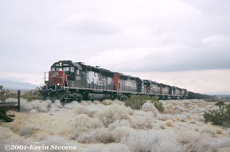 Many years after its demise, remnants of the once great Southern Pacific linger on having dodged the big yellow paint brush. Shown here are a pair of SP painted units resting at Monolith. There are still many SP units used on the locals in and around the Mojave area. They are still regulars on the Mojave Flyer and Blitz Locals.