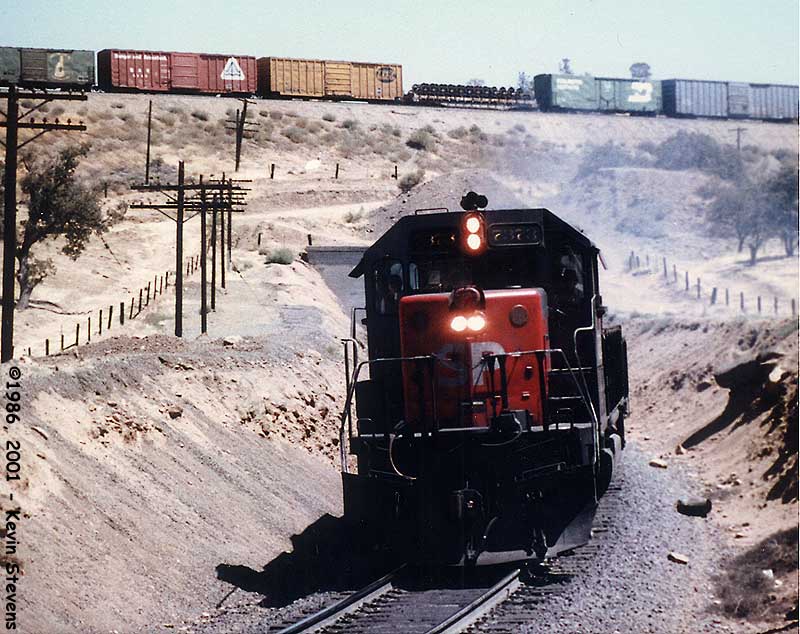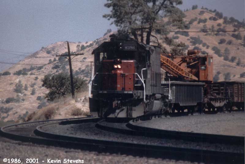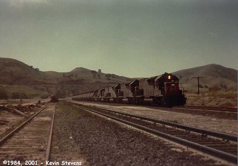 In a scene dated only by the missing gyralights on the locomotive, SP SD40T-2 #8279 sits in the helper spur at Bena, waiting to help another Eastbound up to the summit of Tehachapi Pass. With the more widespread of Remote Controlled Distributed Power by the Union Pacific, the helper spur now sees service mainly as a bad order set out spur.