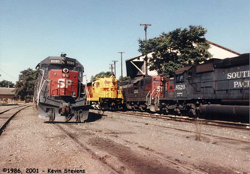Lines of SP power both awaiting service and freshly shopped sitting quietly on the storage tracks on the Southeast side of the shop complex.