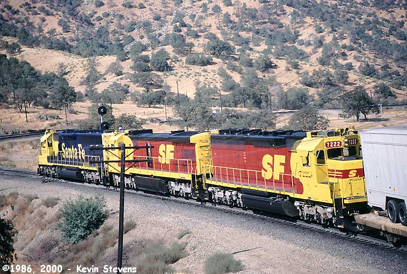 An eastbound Santa Fe freight led by SD45-2 #7228 nears the east switch of Walong siding. Santa Fe renumbered their rebuilt SD45-2's into the 5800 series when the merger was denied, making the 7200 series very short lived.