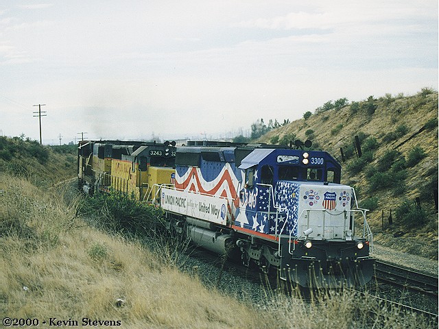 Eastbound train led by UP #3300 in a special paint scheme honoring the United Way.