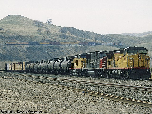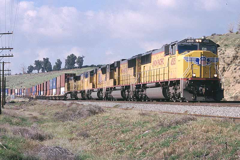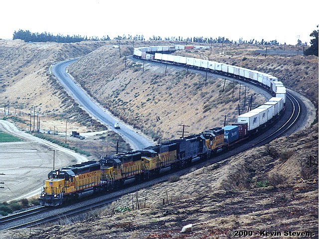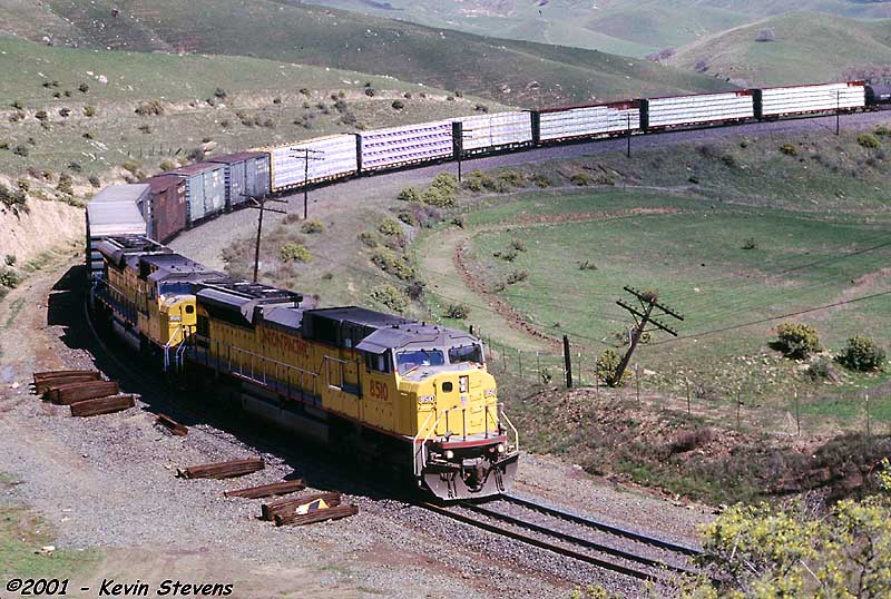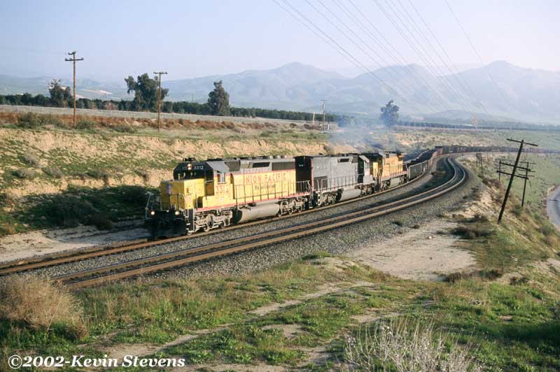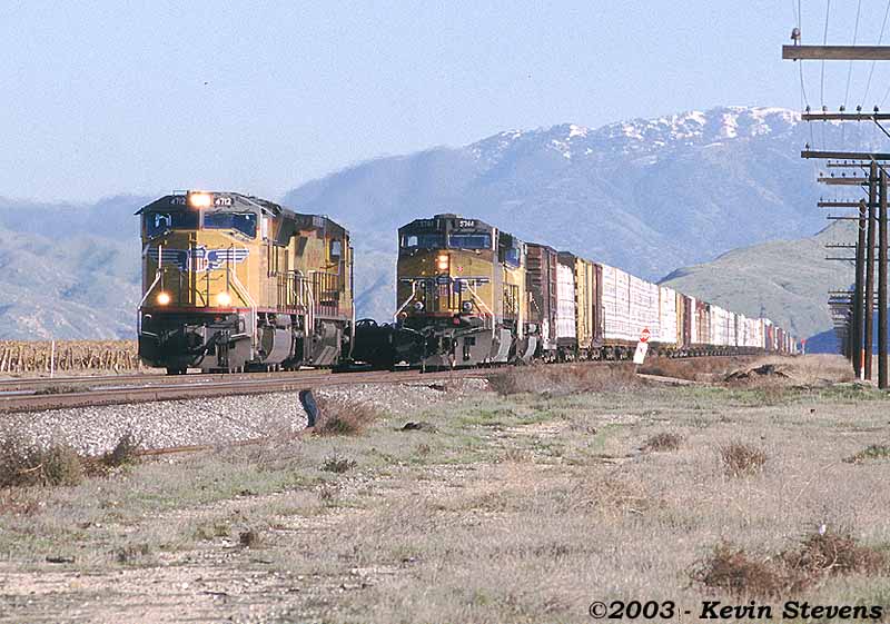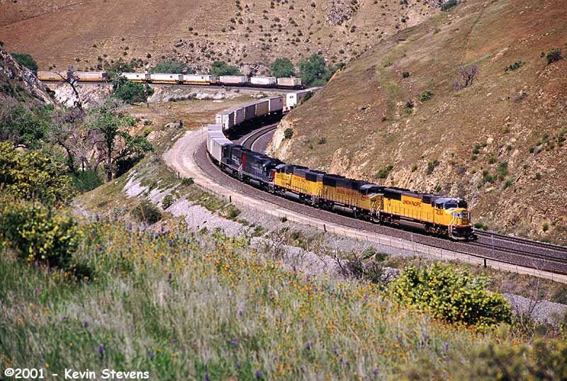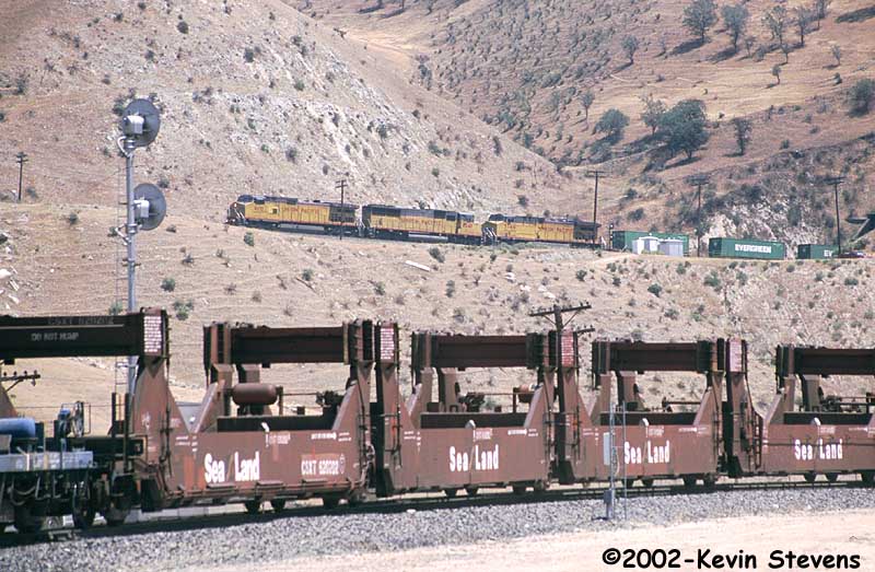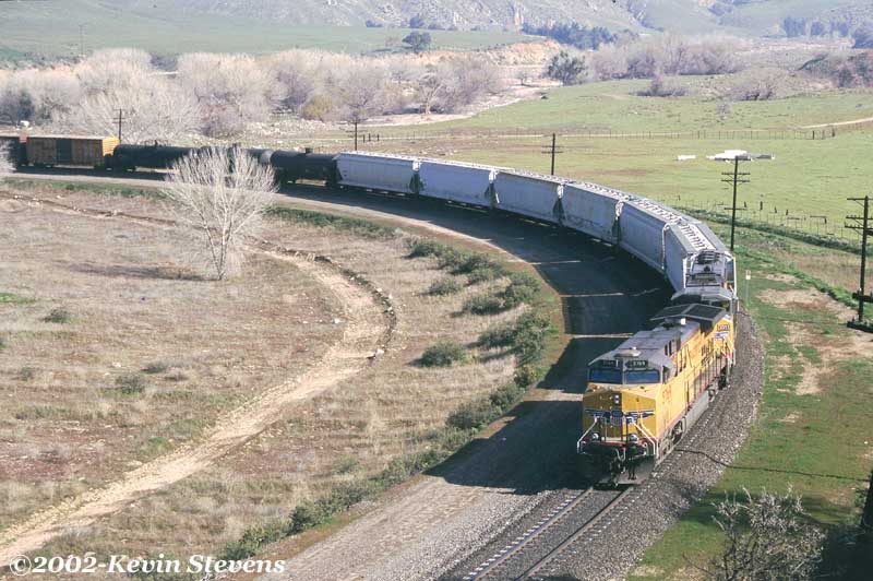 Due to wet weather and related mudslides and washouts, UP detoured several trains down the Central Valley and over Tehachapi Pass that usually traverse the Coast Line. One such train was the Oakland to Long Beach baretables, shown on the Loop at Walong.