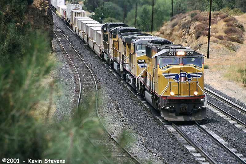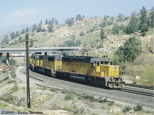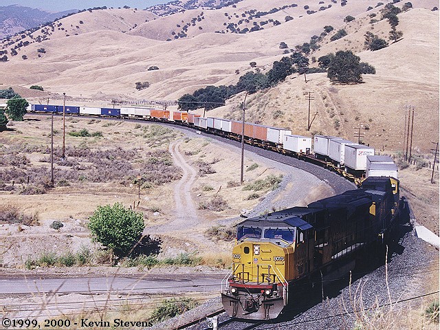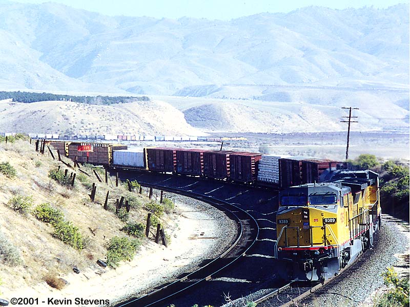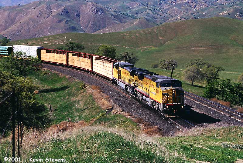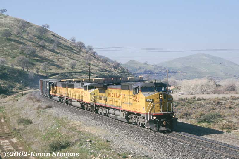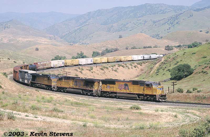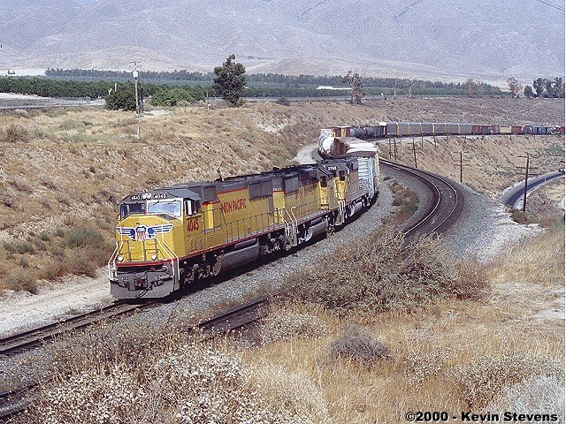One of the most reliable schedules over Tehachapi is UP's Z-SELC which usually heads East out of Bakersfield in the mid-day hours. Here, the train is shown rolling uphill through Woodford led by one of UP's new SD70M's.