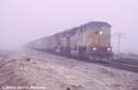 A Westbound UP manifest emerges from the fog near Edison.