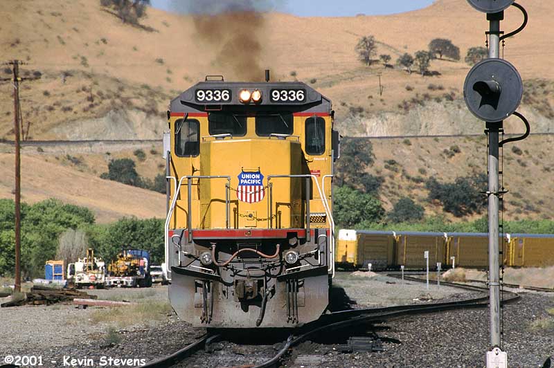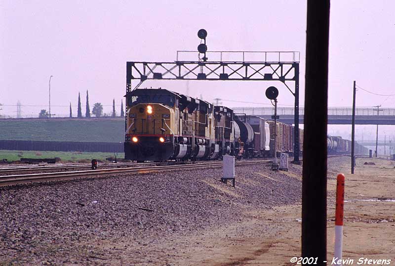 Hazy midday sun greets a Westbound UP train as it enters the Bakersfield Yard and a crew change before continuing on to Roseville.