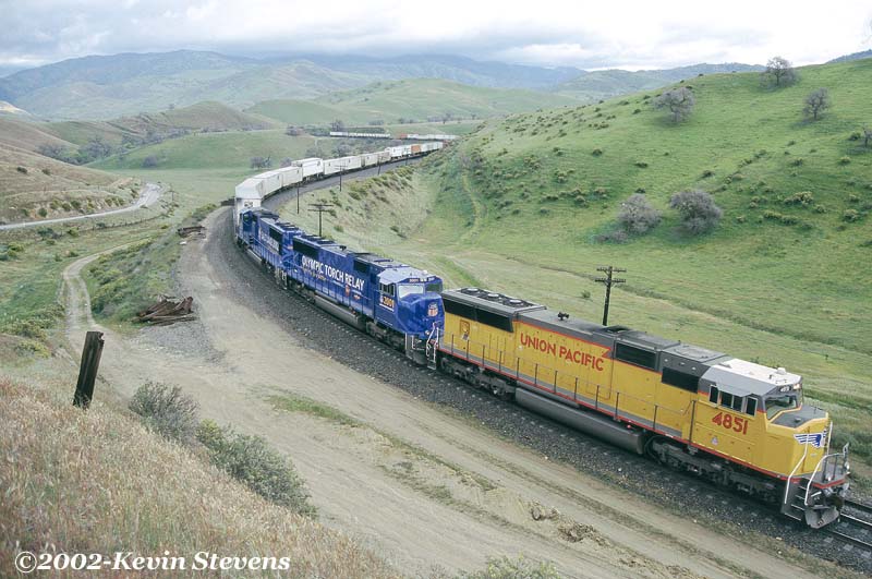UP train Z-SELC-22 led by new UP SD70M #4851 and UP's two specially painted Olympic Torch Relay SD70M's waits for a Westbound to clear the crossovers at Sandcut before heading toward Tehachapi and ultimately Los Angeles.