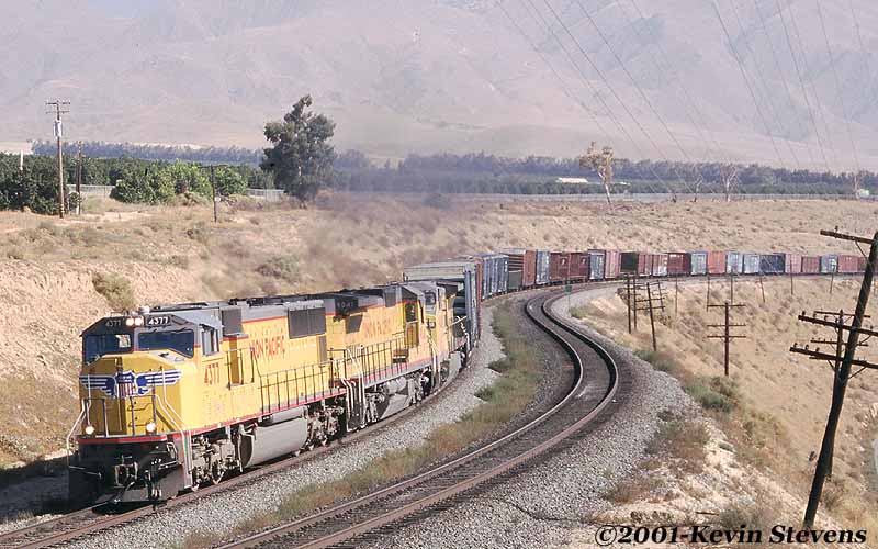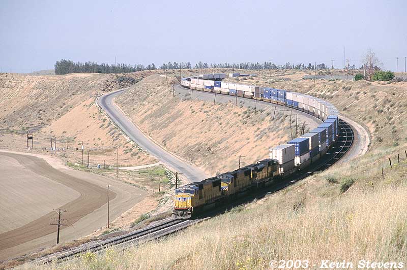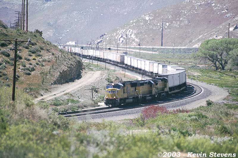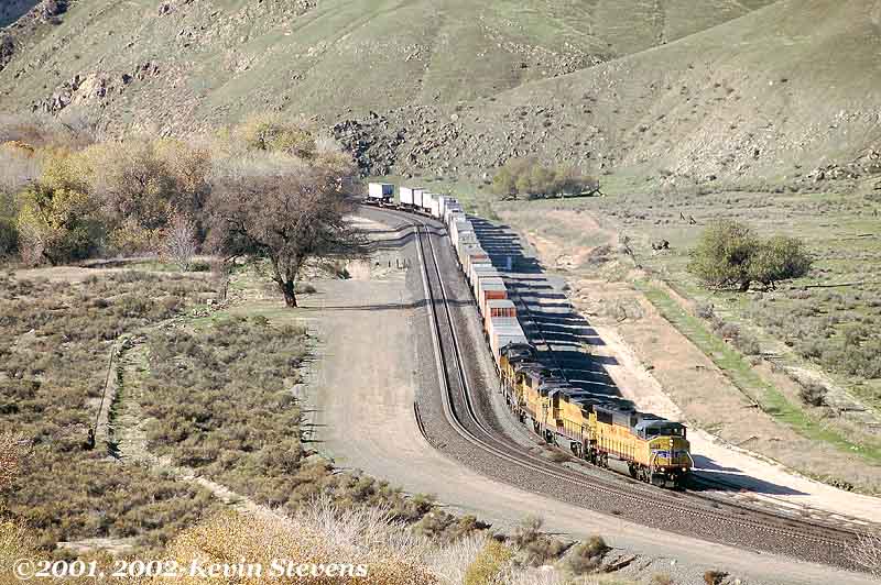An Eastbound UP intermodal drifts down the short grade at Sandcut before tackling the long grade ahead. This short downgrade allows the rail line to enter the Caliente Creek basin and eventually leads the line to parallel the Caliente Creek for several miles between Bena and Caliente.