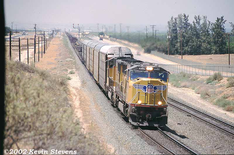 An Eastbound Auto Rack train waits it's turn for a trip over Tehachapi Pass in the Bakersfield Yard. Power for this train: Two new winged SD70M's and an ex-SP Tunnel Motor in UP colors.