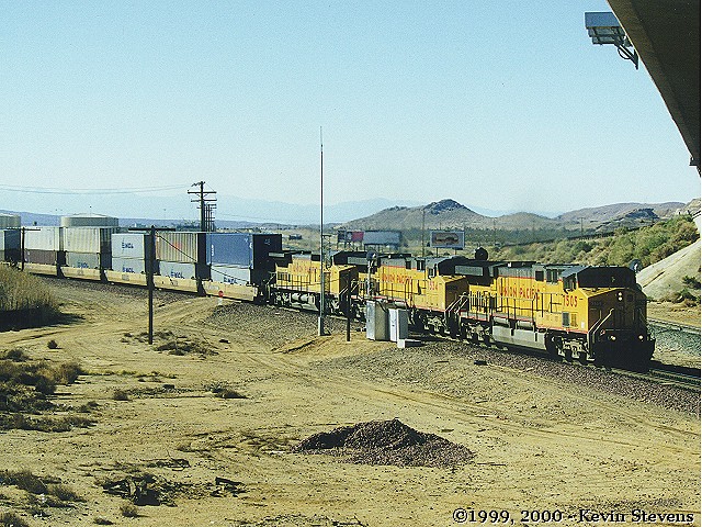 A Westbound stack train on BNSF track is approaching the junction with the UP at Mojave. The UP now has trackage rights between Mojave and Daggett, allowing direct access between the UP Valley line and the LA&SL through Las Vegas to points east.