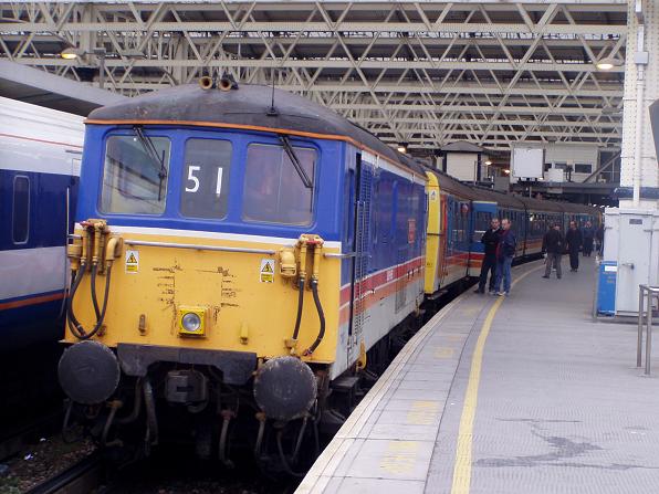 You are probably wondering why a 73 electro-diesel Locomotive has been included on a tribute site to slam door multiple units. Let me explain - on the 16th of April 2005 South West Trains brought 73109 out to mark the last day in its current livery. It peformed an all day diagram but it did not do it on its own. 421397 and 423481 also joined the party and the trio operated trips to Alton and Basingstoke. Sadly I was working in the morning so I could not get there in time for the Alton journey, but I managed to bag a ride to Basingstoke and back. Below are a few pics to mark a very special day.