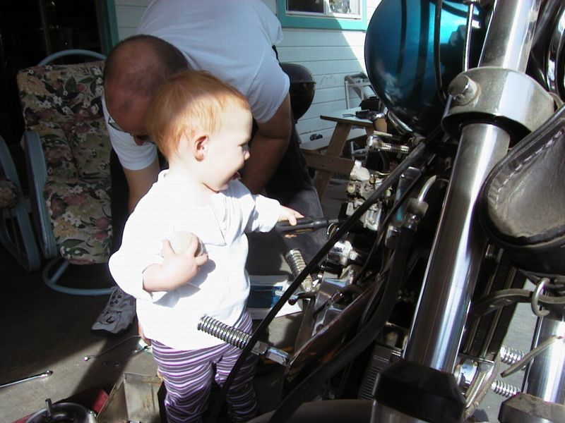 Here in October 2002, daddy took a picture of her helping papa tune his Harley.