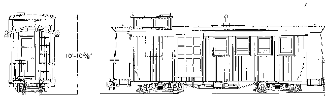 The width of 4'11" is about the maximum alowable for stability. #556 had an offset door on the cupola end as the cupola seat was on one side of the caboose only. It works out well in this design, all that was needed was to widen the door to about two feet. I left the roofwalk and ladders on in the drawing, but for practicality they probably won't be installed. The body length is 10' 8" and the end platforms are 18" wide.