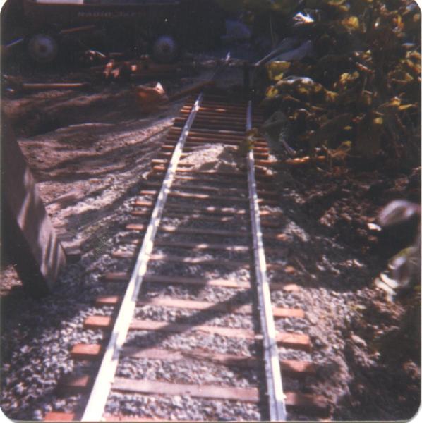 I ordered 40 feet of rail, spikes and joiners from Pete Nuskey (who I believe is still selling the same rail) in 1977 when I was 13 years old and started building the backyard siding to the fence with all scale materials: Along with Nuskey's excellent scale supplies I used redwood 1x1s for ties, decomposed granite sand for a roadbed base to hold the track firmly in place, covered with pea gravel obtained from some yard somewhere for finished ballast. I built a three-point track guage out of some scrap iron at school shop to set the gauge accurately. The track wouldn't quite stay the way I liked it (I didn't pre-bend the rails to the 30 foot radius), so I drilled holes in the ties at about four foot intervals and inserted 12" spikes like big atlas flex-track!