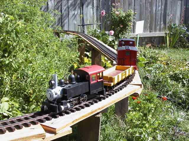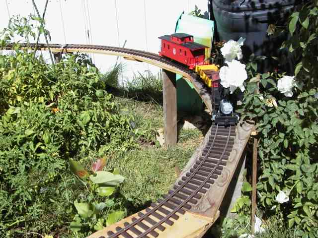 This past weekend (September 14, 2002) the meeting of the infamous Southern Idaho G-Scalers went on in Boise and I was unable to attend, so I had my own Garden Railroad Show at the in-law's house in West Boise. I have been planning to install my portable track that served as the lower level of our Thomas the Tank Engine display train (in Emmett in June) in my wife's garden and I finally got it done.