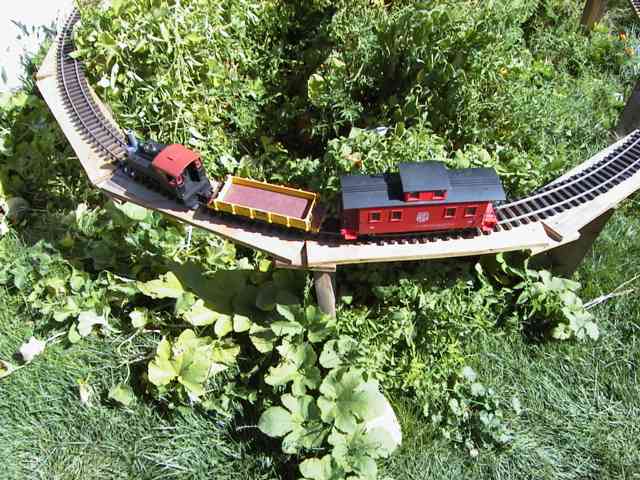 As a temporary layout it will be gone with the garden in a matter of weeks so the track is not attached to the roadbed (actually the power is just connected with aligator clips so for the photos the train was pushed!) The track is not the truest, but everything seems to work.