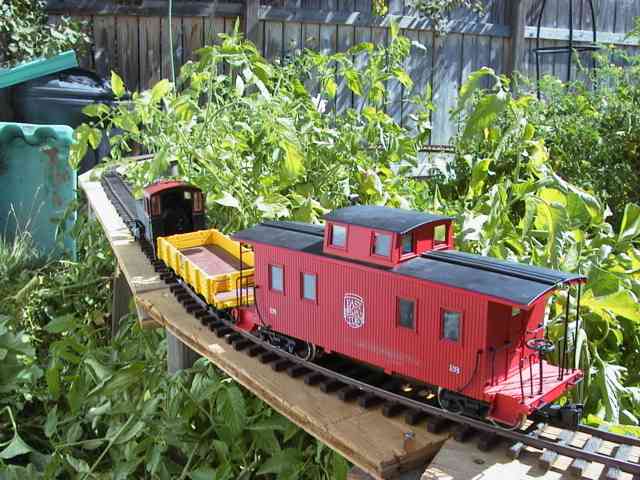 The backside of the layout along the shed and through the forest of tomatoes. The Bachmann EBT caboose looks too large for the Porter and it is. The flat is one of Bachmann's 20' 1/24th scale ones so looks more fitting.