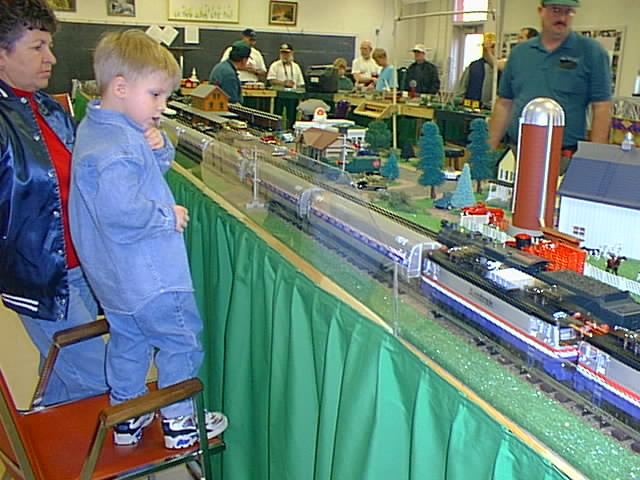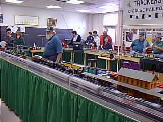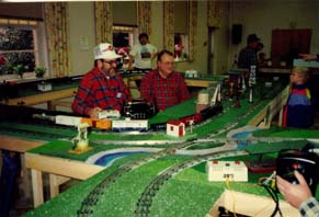 Early days, no skirting, no scenery (5 plasticville buildings) Trackers Gary Wilson, Jim Jamison |