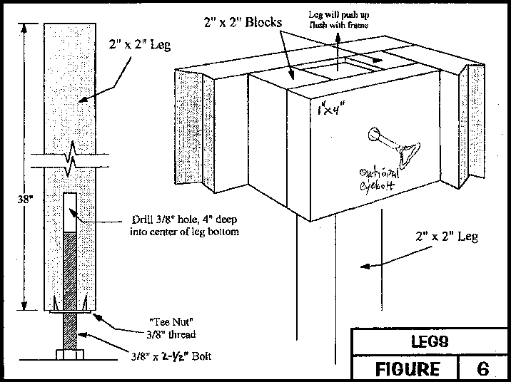 Each module is to have four (4), removable, 2x2 legs. Legs must have 3 1/2" long adjustment bolts, as shown in Figures 1, 3, 5 and 6, to allow for a total of 2" of leveling. With the adjustment bolt 1" out, the measurement from the floor to the top of the mainline rails is to be 40". With the deck and rail heights previously described, this necessitates a leg length of 38". The legs will be positioned as depicted in Figures 1 and 3, for both side and corner modules. The legs will fit into pockets in each location, as shown, and will not require additional attachment to the module when being used in a club, interconnected layout. If any additional leg attachment is desired, an eyebolt through a hole drilled in the leg pocket and leg can be used.