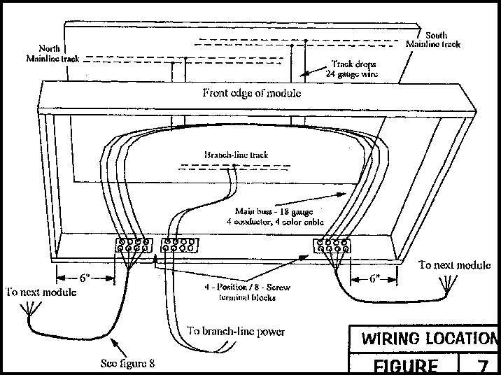 MainlinesTwo mainlines, on Midwest #3013 cork roadbed, with location dimensions as shown in Figures 2 and 4 will be provided as a minimum on each module. The mainlines can be curved or straight, but the last 3 1/2" of each end of the mainlines must be straight and parallel to the front edge of the module, centered at 5" & 7" from the front edge of the module. Each track will end 4 1/2" from the extreme edge of the module to allow for connecting tracks and rail joiners. A crossover between mainlines, using the previously mentioned #6 switches, is optional. If installed, the crossover must have insulating rail joiners on both rails. Any deviations from these specifications must be obtained from the standards committee.