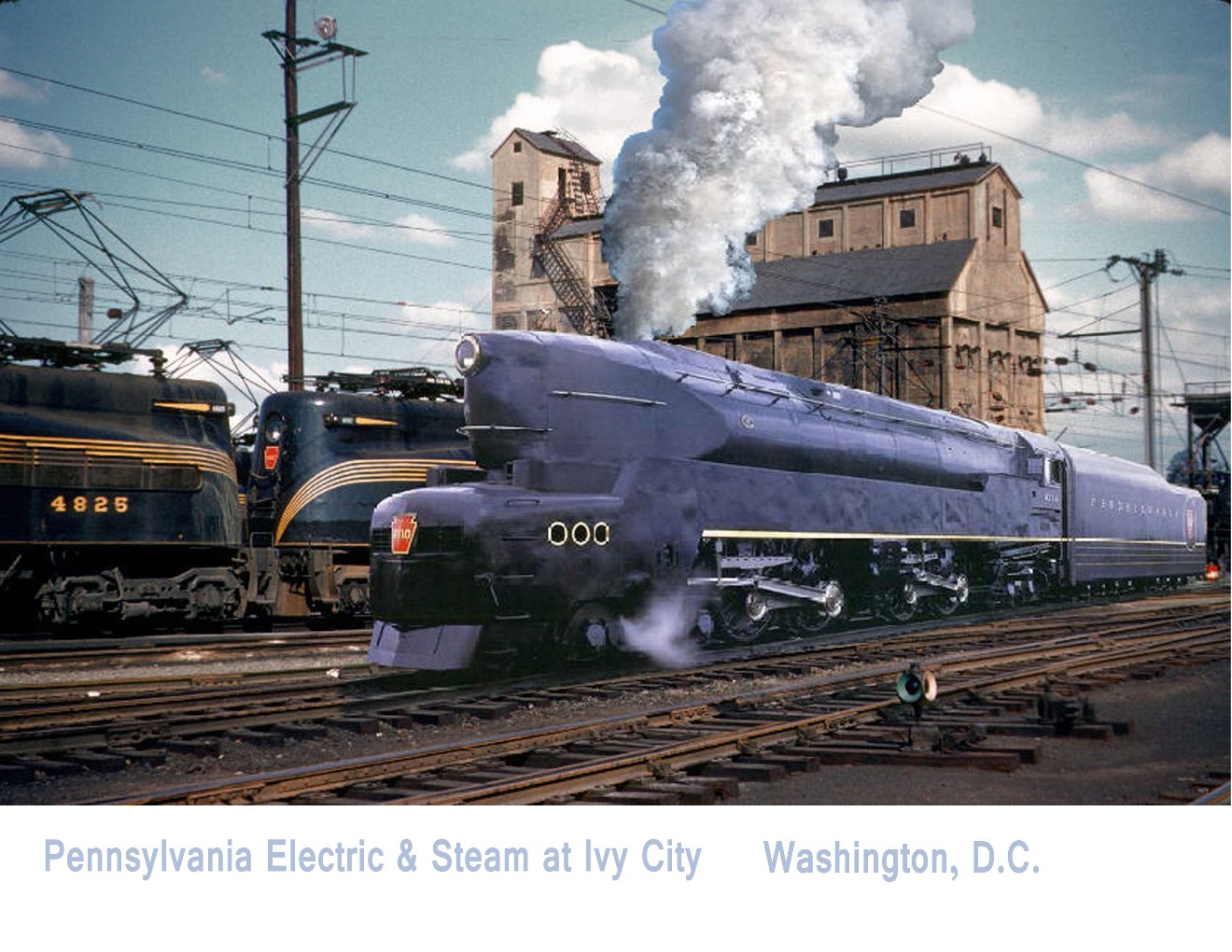 We can dream of seeing a T1 class duplex-drive 4-4-4-4 steam locomotive passing through Ivy City in Washington, DC during the heyday of the Pennsylvania Railroad. (Right, click to enlarge.)