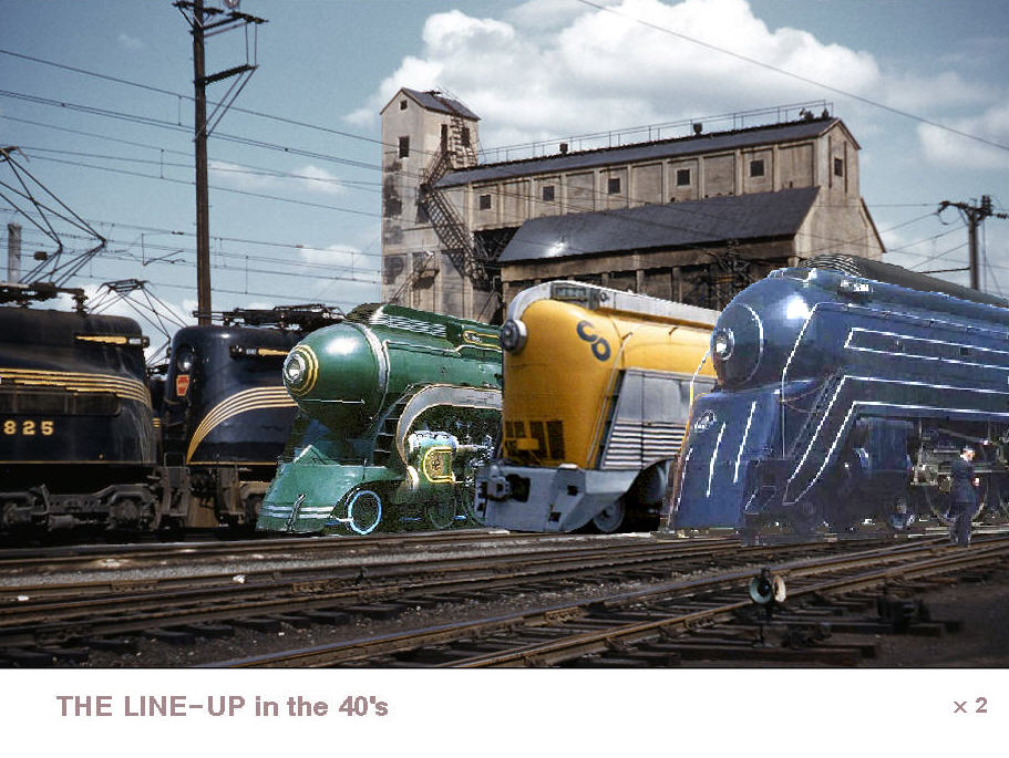 A theoretical streamlined steam engine lineup from the 1940s at Ivy City. (Left, click to enlarge.)