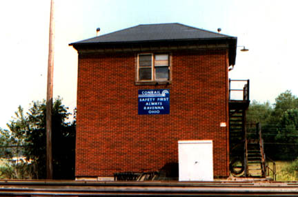 In 1981, Conrail began an East Coast cutback on lesser-used track. Ravenna was hit hard when Conrail took out the one line which ran through the downtown area (now where McDonald's is) and the two transfer tracks that connected the PRR with the B&O. Now RAVE had no purpose, it had no junction to guard anymore and Conrail cut it down form a full-time to a part-time tower.