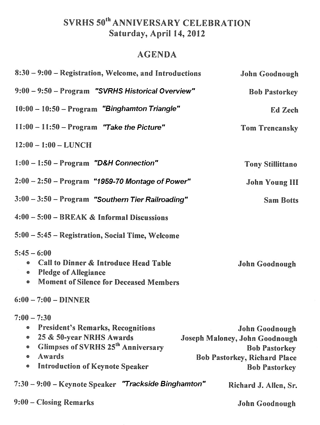 March 24th, 1962 marks the date of our Charter with the National Railway Historical Society as the Susquehanna Valley Chapter. In celebration of our 50th Anniversary our Chapter held a special full day of events on Saturday, April 14th, 2012 at the Brothers 2 Restaurant in Endwell, NY. There were several multimedia program presentations by notable photographers and a dinner banquet in the evening with a guest speaker and program. There were also some special short program presentations and a roundtable discussion. The theme was Railroading in the Southern Tier Region over the past 50 years As part of this celebration, the Susquehanna Valley Chapter invited current members, former members, and special guests of the Chapter. Both the daytime and evening events were also open to the public. This turned out to be an exciting event enjoying railroading at its best along with meeting old friends and making new ones. SVRHS solicited help in retrieving past history of Chapter sponsored special events and activities. These were documented as photo memories for use as Chapter programs and as a means to attract new members.