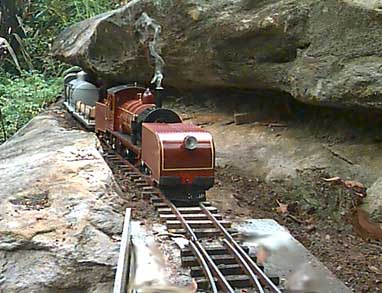 (4) The sandstone rock ledge at Sandstone (where else?) was jack hammered out of an existing 'crack' in the rock. The train is heading for Sandstone station.