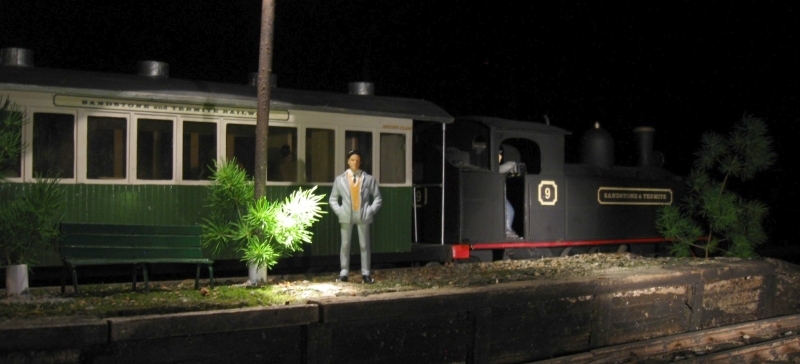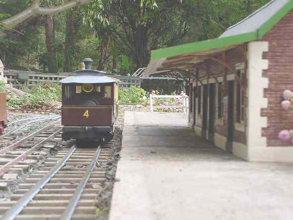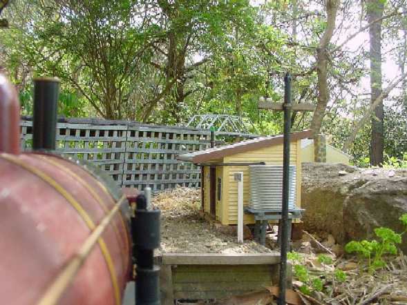 (5) OLD Lilyvale station as seen by the Garratt fireman. Those telegraph poles are always in the way in photos! In this case they are actually disguised garden water sprinklers fitted with crossarms and small beads for insulators.